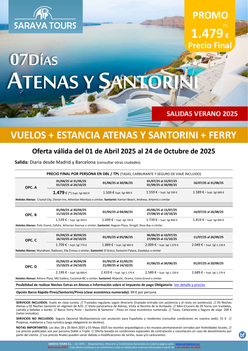 Promo Islas! Atenas y Santorini 7 días: Vuelo, Hotel, Traslados y Visita Atenas Incluida hasta Oct 26