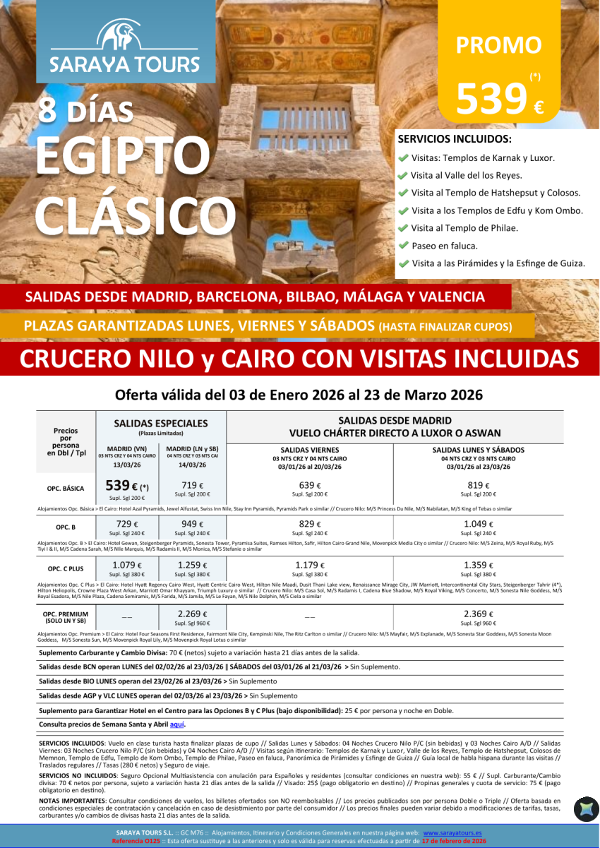 Egipto Clásico 8 días. *Salidas Bcn, Mad ,Agp ,Bio & Vlc * Crucero y Cairo + visitas dsd 499€ hasta Dic26